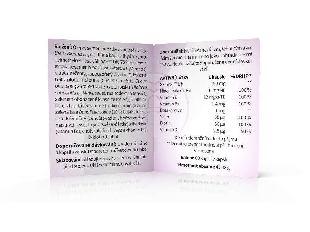 Olej ze semen pupalky dvouleté (Oenothera Biennis L.), rostlinná kapsle (hydroxypropylmethylcelulosa), SkinAx2TM Lift (75 % SkinAx2TM: výtažek ze semen hroznů (Vitis vinifera L., Vitaceae), citrát zinečnatý, zapouzdřený vitamin C, výtažky z plodu melounu (Cucumis mělo L., Cucurbitaceae), 25 % výtažek z květu ibišku (Hibiscus sabdariffa L., Malvaceae), maltodextrin (nosič)), selenem obohacené kvasnice (selen), D-alfa tokoferyl acetát (vitamin E), nikotinamid (niacin), zelená řasa Dunaliella salina 10 % (betakaroten), oxid křemičitý (zahušťovadlo), hořečnaté soli mastných kyselin (protispékavá látka), riboflavin (vitamin B2), cholekalciferol (vegan vitamin D3), D-biotin (biotin)